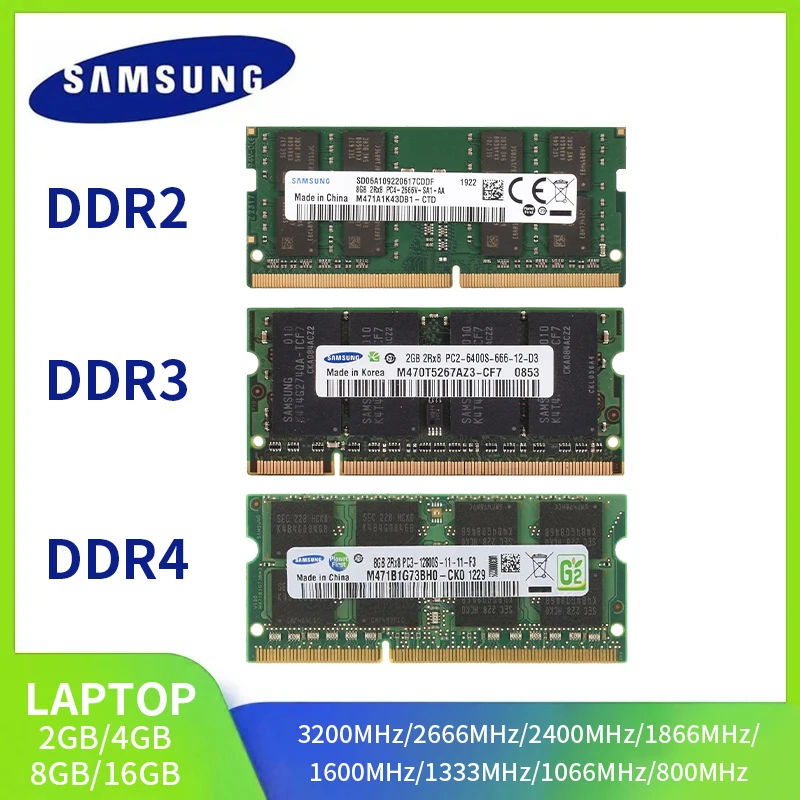 แล็ปท็อป SAMSUNG มาพร้อม RAM DDR4 DDR3 DDR2 ตั้งแต่ 16GB ถึง 2GB ด้วยความเร็วตั้งแต่ 3200 ถึง 667 MHz และยังมีกลุ่มผลิตภัณฑ์ Notebook Memoria Samsung อีกด้วย